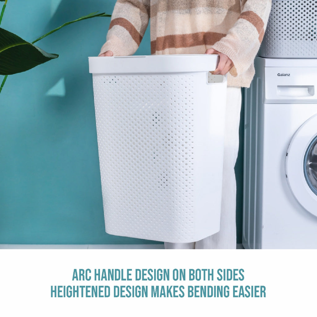 Organize your space with this 60L laundry basket. Features a cover lid, air vent holes for breathability, and a space-saving design. Approximate size: 43.5x34.5x57.5cm.
