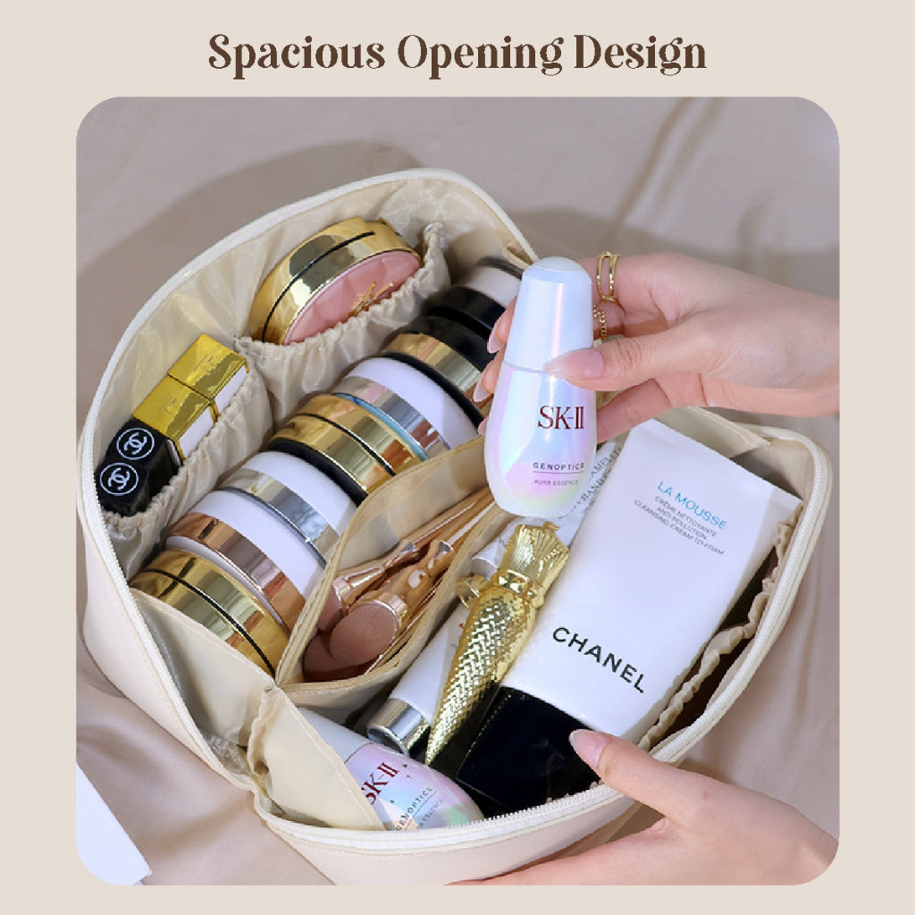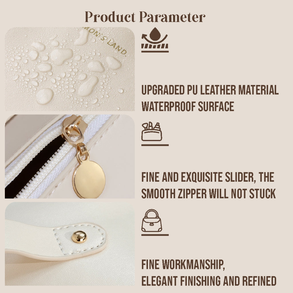 High-quality PU leather makeup bag with water-resistant surface, perfect for cosmetics, toiletries, and more. Spacious design, durable handle, and ideal for travel or daily use. Available in Almond, Black, Pink, and Brown.